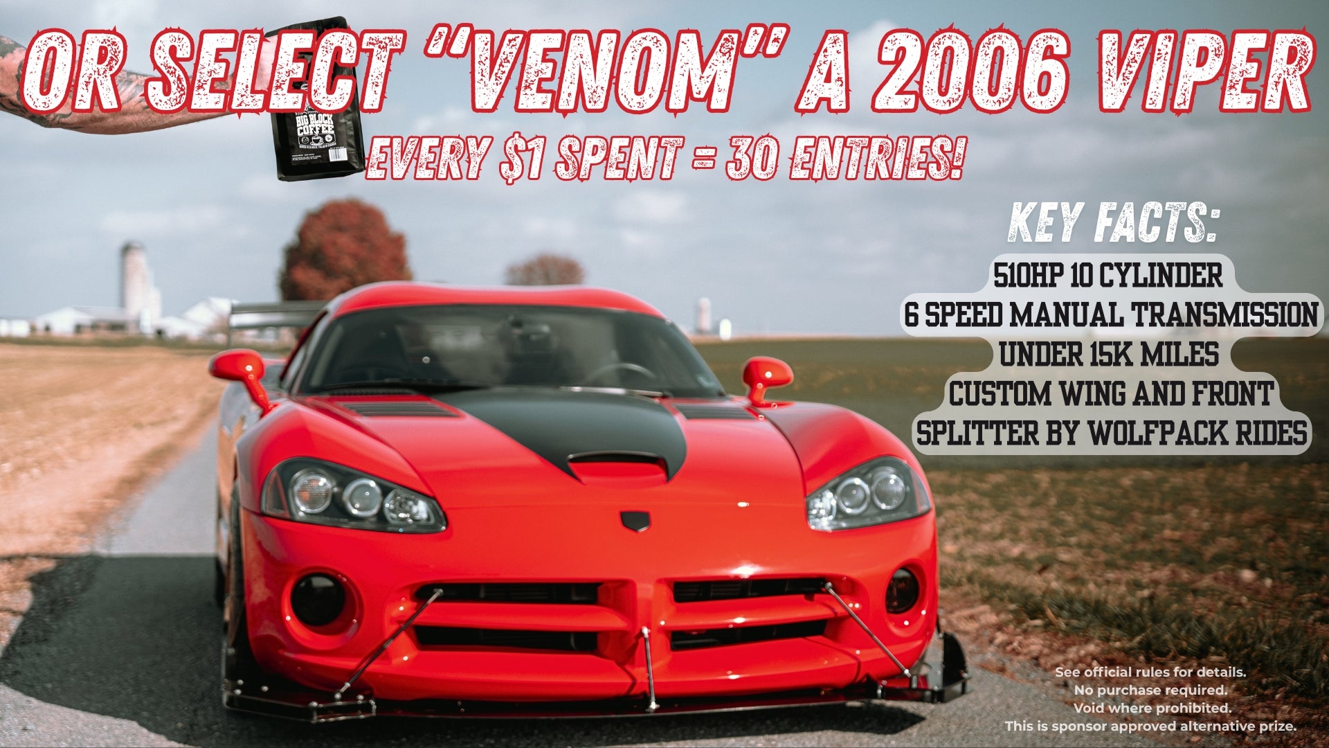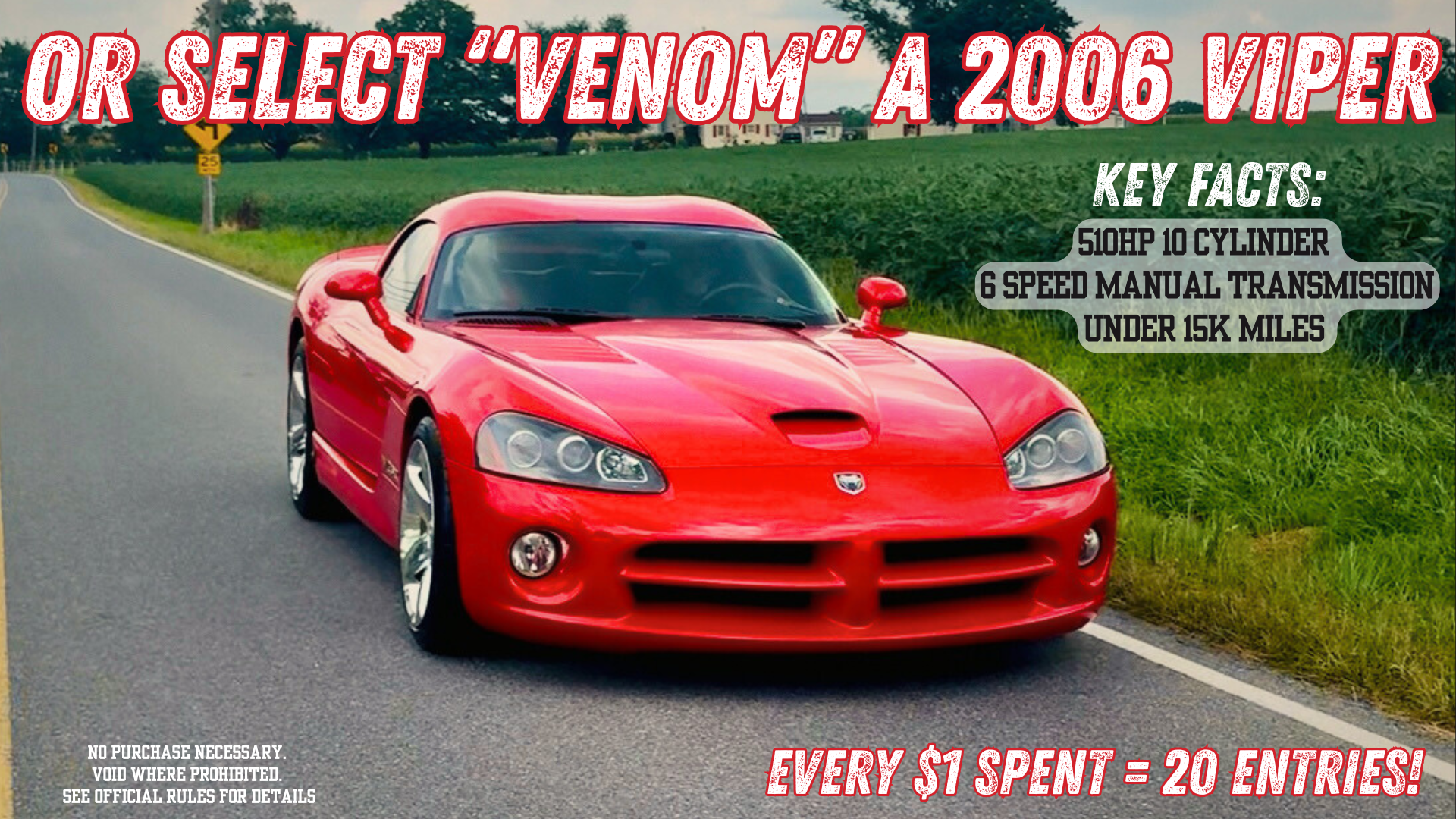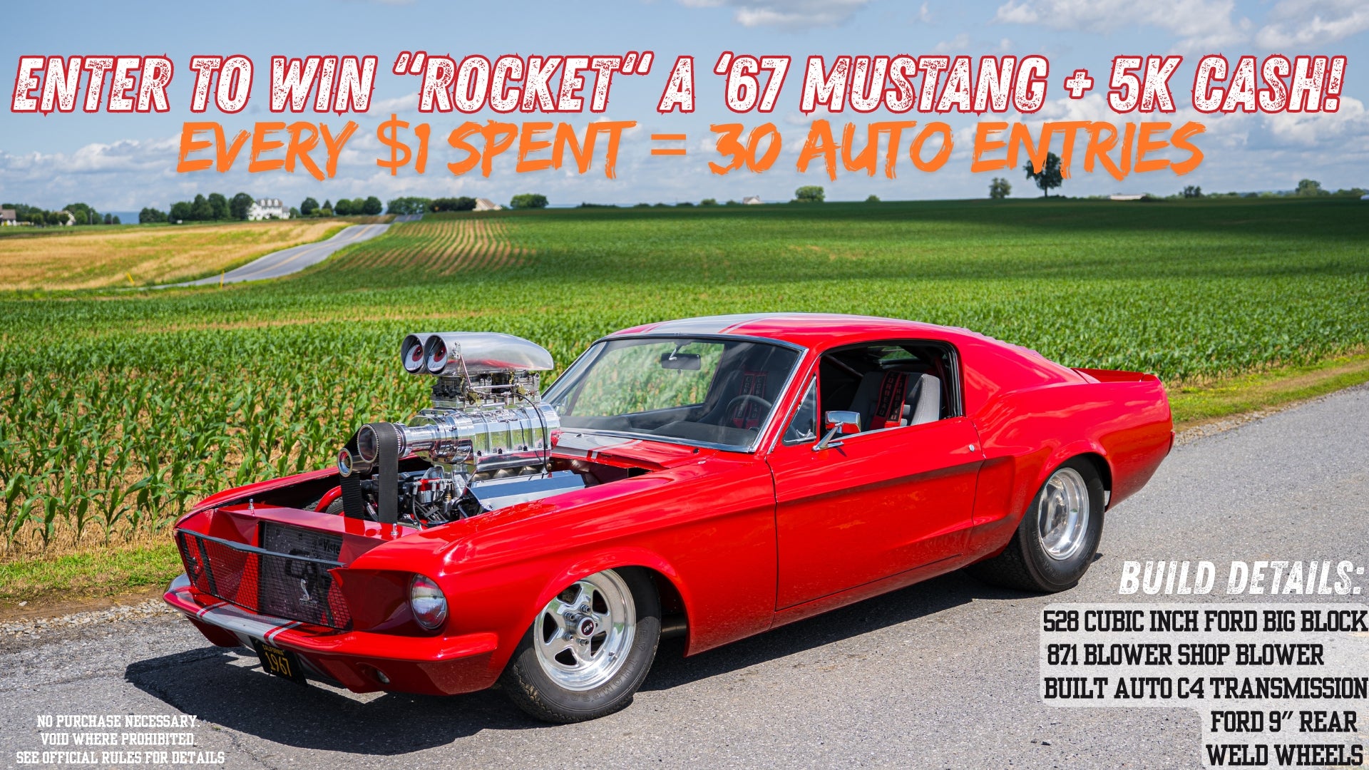 PRIZE: Winner Can Select The 67 Mustang or Cash Prize of $60,000! In Addition to the Cash Prize, we have approved two alternative prizes! If Rocket is too CRAZY, you can select Venom (2006 Viper) or Ghost (2017 Corvette Z06)